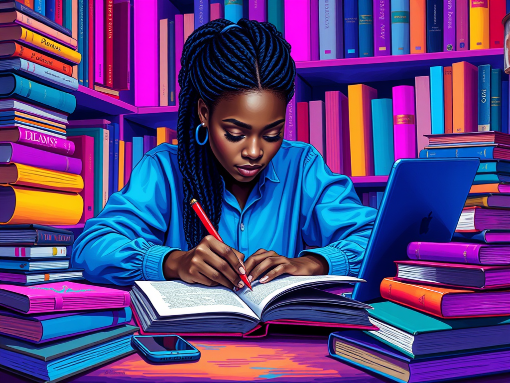 An artistic arrangement of open books, a journal, a smartphone, and a laptop amidst colorful bookshelves, symbolizing creativity and storytelling. AI generated.