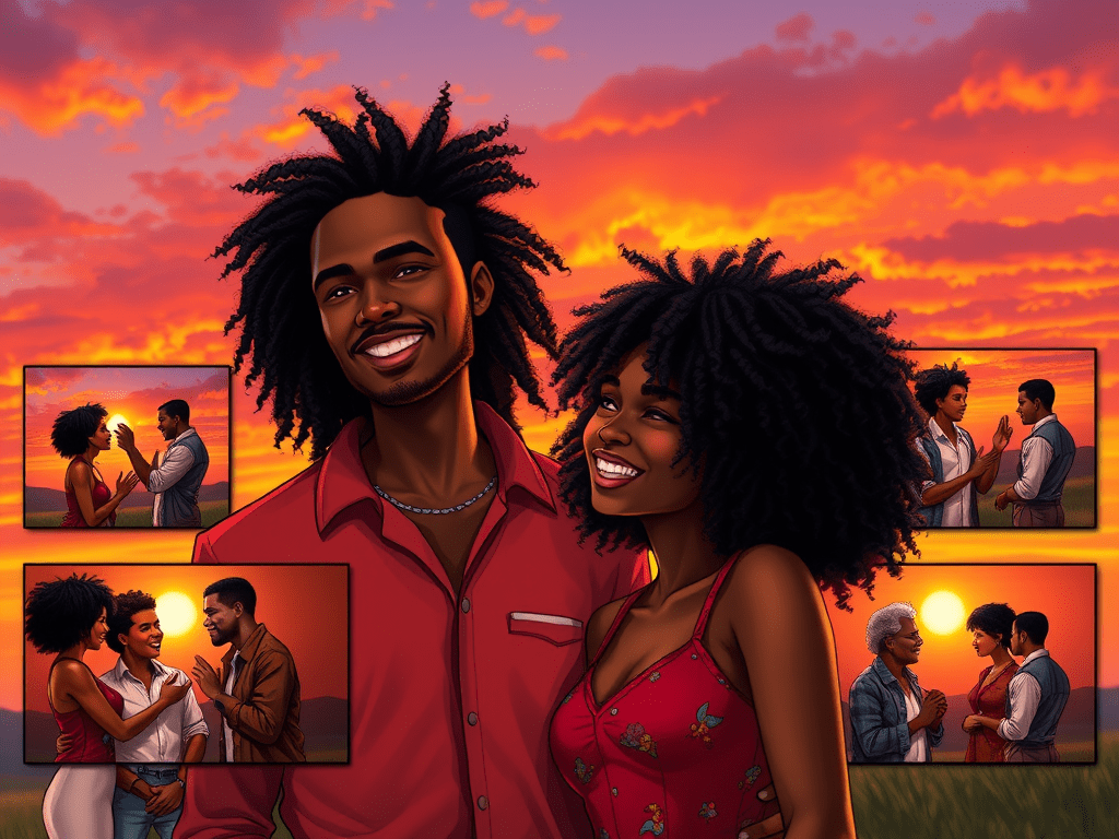 A vibrant digital illustration capturing a group of diverse individuals engaging with books, technology, and music, surrounded by roses and musical notes. AI generated.